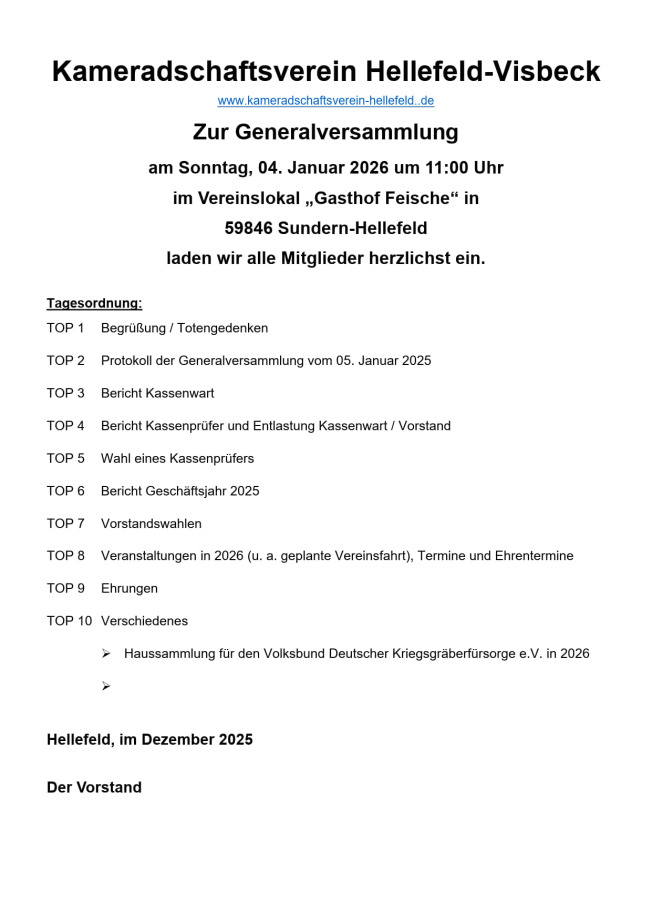 KameradschaftsvereinHellefeld-Visbeck![]() ____________________________________________________________________________________________ Es gibt eine WhatsApp-Gruppe für alle Interessierten. In dieser werden Infos zu Aktivitäten und Anmeldemöglichkeiten angeboten. Wer Interesse hat, sendet bitte seinen Namen und Handy-Nr. an 1872@kameradschaftsverein-hellefeld.de.